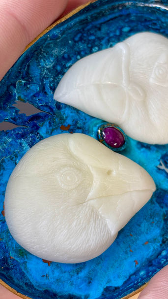 At the centre, a ruby stands for the egg, bright enough to feel like an alarm, and precious enough to demand care. Two beaks cradle it, a shared gesture of guarding. Around them, pierced voids make absence physical, set behind the birds like shortages they cannot reach. Fish-shaped openings represent prey that fails to reach colonies when ocean conditions shift and when commercial fishing exerts pressure. When food is scarce, chicks weaken, and a season can fail without any predator ever appearing. Tussock-shaped openings depict the takahē’s food and cover, reduced where introduced deer compete for the same snow tussocks.